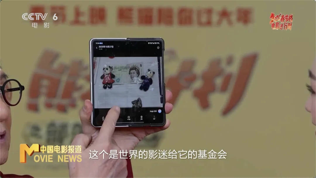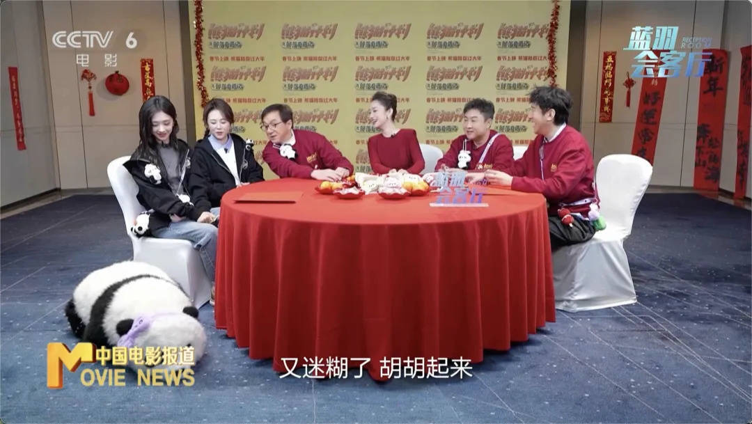 蓝羽:体验了一下当地的风土人情。这部电影当中还有一个非常重要的角色,就是熊猫胡胡。今天也来了,让我们欢迎熊猫胡胡。