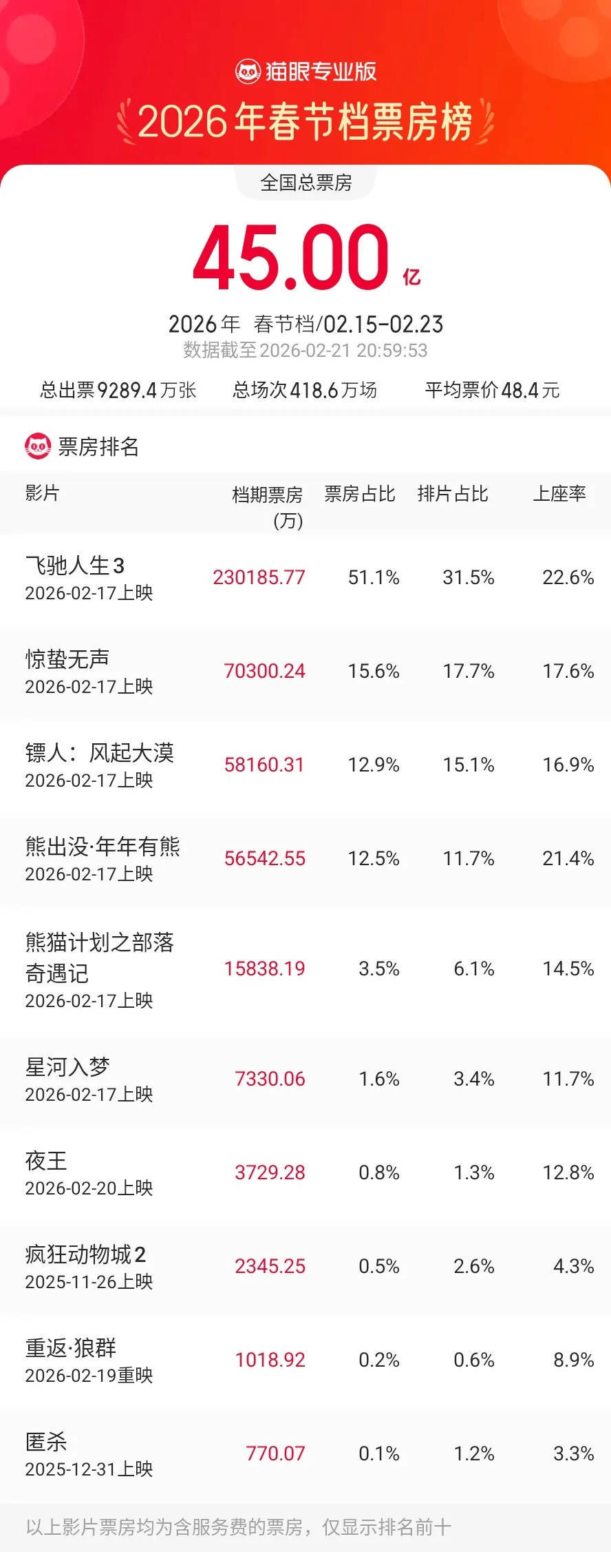 1905电影网专稿 截至发稿时间,2026年度总票房(含预售)突破70亿,春节档总票房突破45亿,成龙领衔主演的《熊猫计划之部落奇遇记》也正在热映。