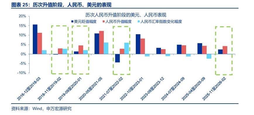 1第一阶段,4月下旬至“日内瓦协议”期间,人民币升值是在贸易战预期缓和背景下的修复;2)第二阶段,5月中旬至8月下旬,人民币跟随美元汇率震荡;3)第三阶段,9月的汇率升值,主因结汇加速与美元走弱;4)第四阶段,10月中旬至11月下旬,在9月底一度实现“三价合一”的背景下,央行或重启逆周期因子、不断调升的中间价对升值有一定引导;5)第五阶段,12月至1月下旬,美元走弱与“结汇潮”共振;6)第六阶段,2月以来,美元反弹,但人民币升值进一步加速