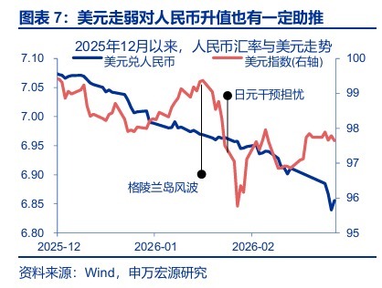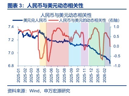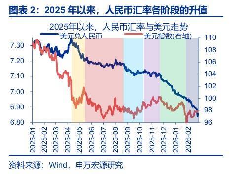 2026年开年以来,人民币延续走强,1月下旬以来更是一度出现了加速迹象。截至2026年2月27日,离岸人民币一度升破6.83关口、直逼6.80。放到整轮升值周期来看,近期的升值加速特征也较为显著:2025年4月以来的升值周期可以分为6个阶段1,除第一阶段在贸易战缓和的预期中、人民币超调修复较快外,2025年5月至11月的升值都是相对稳定的,人民币兑美元的年化涨幅约2.7%。但12月以来,这一升值速度明显加速,12月至1月,人民币兑美元的年化涨幅升至11.5%;2月以来,这一升值节奏更是加速至24.6%。
