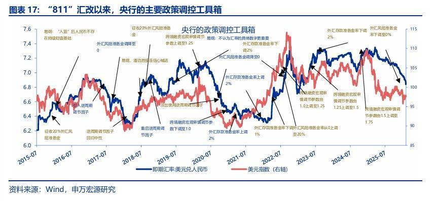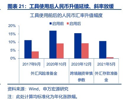 但回溯来看,央行的调节工具更多起到“调节奏”作用,对趋势的影响或相对有限。以央行下调外汇风险准备金率为例,2017年9月下调后,人民币汇率在短期调整后,再度由6.67升至6.29,但升值节奏由下调前的年化11.2%降至下调后的4.3%;2020年10月的下调中,人民币在3个交易日后重振旗鼓、由6.74再度升至6.47。其他外汇调节工具的影响也与之相仿。