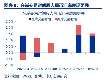 1月份人民币汇率升值更多是“年终结汇潮”与美元走弱共振的结果。一方面,“迟到”的2月春节使得结汇率的改善在1月仍有一定延续性,2025年12月、1月的结汇率分别为61%、59%,均为2017年以来的相同月份最高值;银行代客结售汇顺差分别为999亿美元、888亿美元,录得“811”汇改以来的新高与次高。另一方面,美元的走弱也有一定助力,其背后的主要推手既有对日元汇率持续疲软下日本财政部干预的担忧,也有特朗普挑起的“格陵兰岛”等问题的冲击。分时段拆解来看,人民币汇率既在在岸交易时段受益结汇逻辑延续、也在离岸交易时段受益于美元走弱。