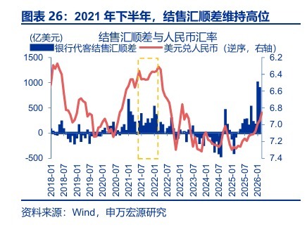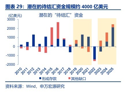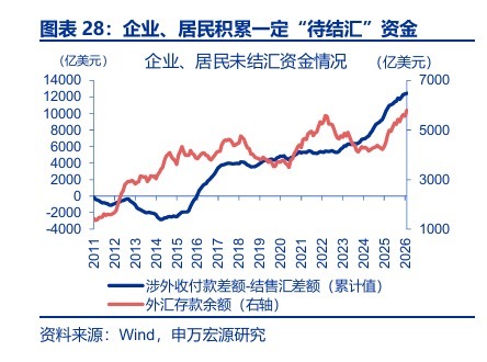 与2021年相比,本轮“待结汇”规模更大、基本面环境更健康,或意味着中长期视角的升值仍有一定延续性。1)资金面视角,2023-2025年积累的“待结汇”规模约4091亿美元,高于2020-2021年积累的2293亿美元。2)基本面视角,2021年我国处于经济周期顶点,外贸繁荣之下,地产下行隐忧与内需疲软初现;而本轮中地产对经济拖累正边际递减、内需也在复苏通道。3)美元视角,彼时升值在美联储加息开启后结束,本轮距离美联储政策大幅收紧仍有距离。后续可能出现的美元反弹、贸易摩擦升温5等或影响人民币升值节奏,但未必会扭转中长期汇率稳步升值的节奏。
