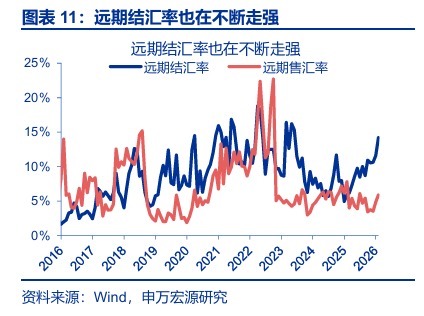 本轮升值前期是季节性结汇与美元走弱共振的结果,但1月下旬以来的进一步加速,已现“恐慌式结汇”迹象。1月27日以来,美元升值1.9%,而人民币兑美元仍走强1.5%。从高频数据来看:1)人民币询价成交量维持在高位,说明“结汇潮”在季节性退坡后或仍延续;2)“结汇潮”中掉期点差不升反落,或因远期结汇率走高、而这反映了企业“升值共识”在进一步强化。