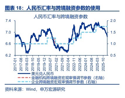 此次操作是央行在汇率过快升值背景下逆周期调节的延续,后续跨境融资宏观审慎调节参数和外汇存款准备金率等工具也有启用的可能。自2025年11月27日以来,央行逆周期因子转正,即已在释放抑制人民币过快升值的信号;截至2月27日,逆周期因子的使用幅度已达793pips、为历史最高。2月27日的外汇风险准备金率调降,正是这一逆周期调节操作的延续。回溯历史,如果人民币汇率延续升值,跨境融资宏观审慎调节参数下调、外汇存款准备金率上调这类工具也有启用可能;历史上,前者有过在2021年1月7日的调降,后者也在2021年5月和12月有过两次调升。