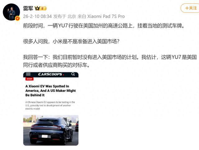 股票配资常识 雷军回应“有人看到小米YU7行驶在美国的高速公路上,挂着当地的测试车牌”:目前暂时没有进入美国的计划 回应 来源:东方汇赢配资 网站:国睿信配 日期:2026-02-11 10:38:51 查看:136