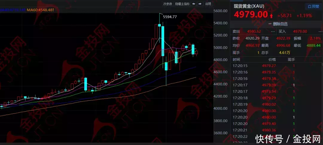 隔夜,现货黄金收盘暴跌162.57美元,跌幅3.2%,报4921.77美元,为一周以来最大单日跌幅。今日欧市盘中,黄金小幅上涨,目前在4977美元附近徘徊。