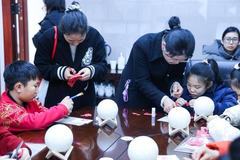 不远处的手工体验区同样热闹。剪纸、月灯制作桌前围满了家长和孩子。红纸翻飞,剪刀起落,纸屑落在桌面上。来自博才建业小学的欧阳润田举起刚做好的剪纸月灯,脸上满是自豪:“这是我和妈妈一起做的。”